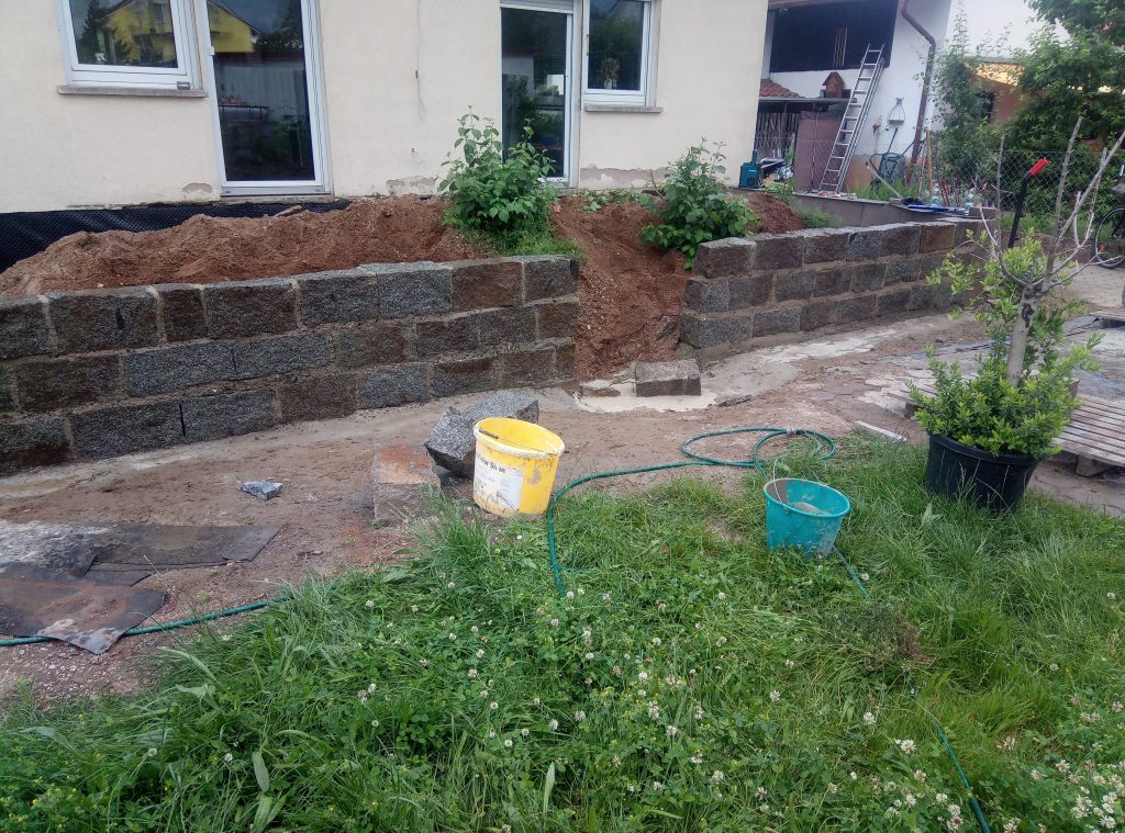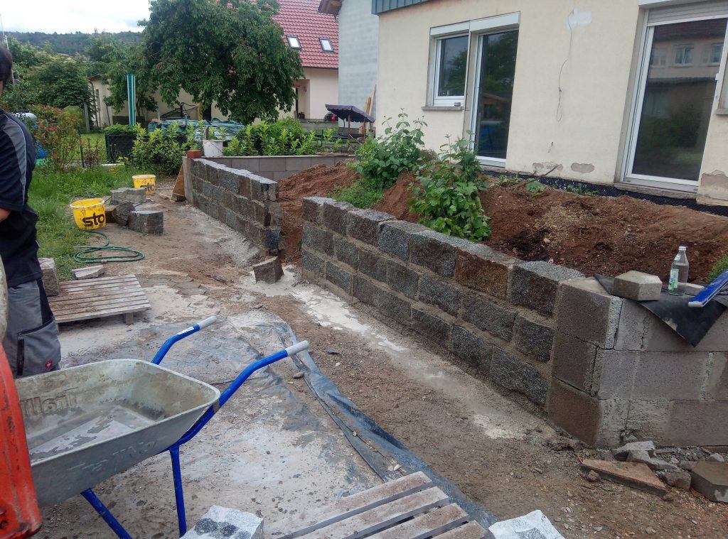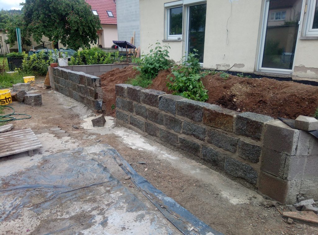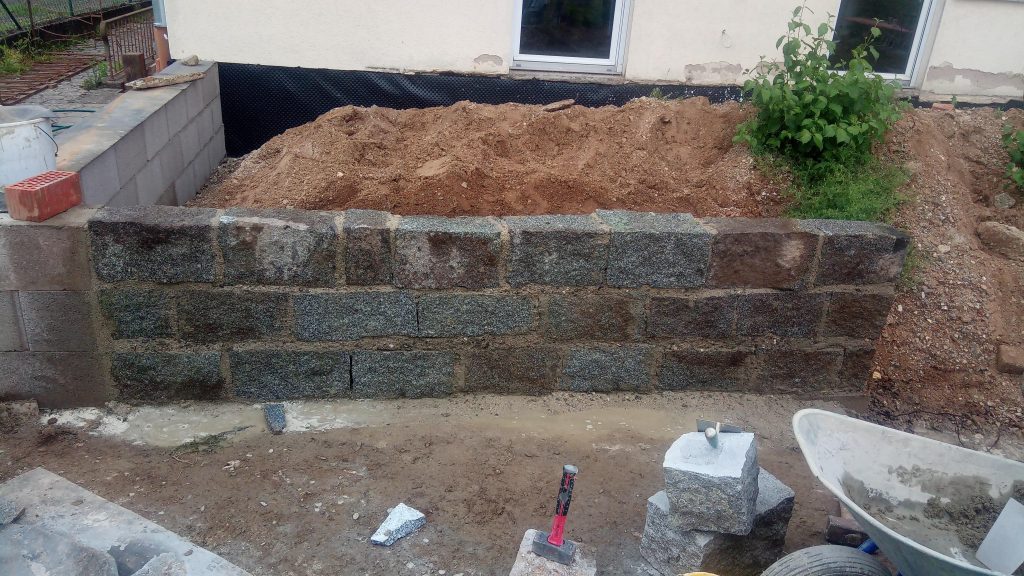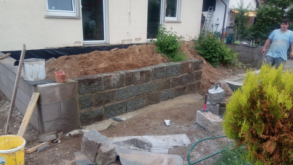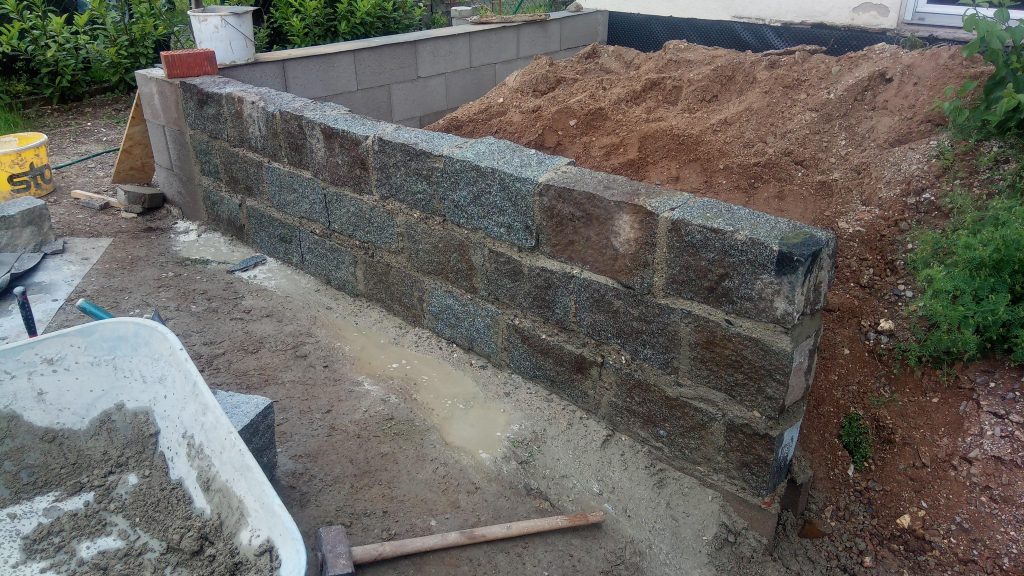 Zunächst mussten Erdarbeiten durchgeführt werden, die Position der Mauer, deren Höhe und Niveau festgelegt werden. Auch habe ich den Sockel der Hausfassade natürlich durch eine Drainage mit Noppenfolie vor Nässe und Wurzelwerk geschützt. Durch meine sorgfältige Vorarbeit, besonders im Fundament und Sockelbereich, ist die Realisierung dann leicht und in sehr kurzer Zeit gelungen.